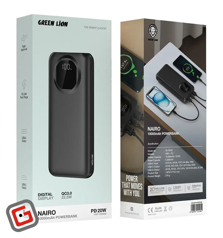 پاوربانک گرین لاین مدل NAIRO ظرفیت 20000 میلی آمپر ساعت