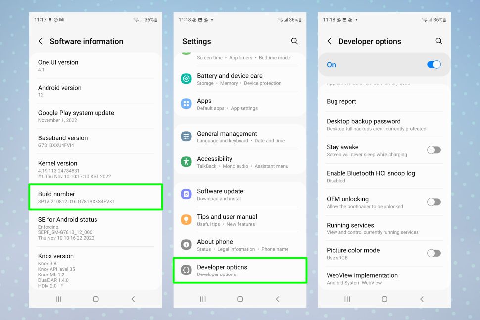 اگر یک کاربر حرفهای سامسونگ هستید، میتوانید با فعالکردن گزینه developer options تجربهکاربری لذتبخشتری برای خودتان رقم بزنید. اما developer options چه امکاناتی برای شما فراهم میکند؟ با فعالکردن این گزینه میتوانید سرعت گوشی را افزایش دهید. نرخنوسازی را روی حالت حداکثری قرار دهید. صفحه را همیشه روشن نگهدارید و برای دستورالعملهایی که به اپلیکیشنها میدهید، بازخورد بصری دریافت کنید. برای دسترسی به این حالت، لازم است مسیر زیر را دنبال کنید:
