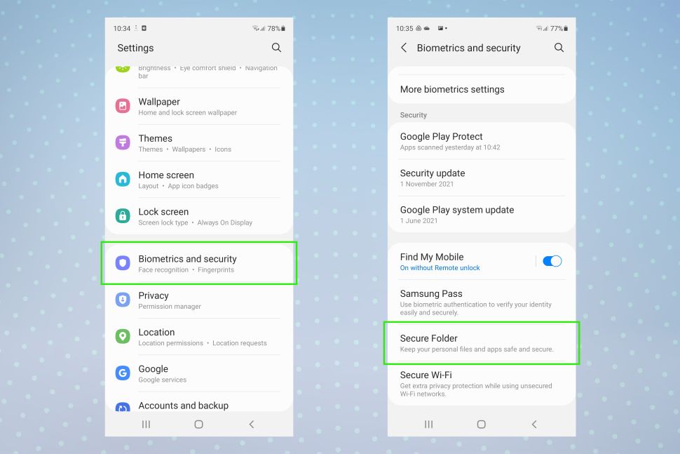 2) در این بخش، گزینه Secure Folder را انتخاب کنید. گزینه Agree را انتخاب کنید و وارد حساب گوگل یا حساب سامسونگ خود شوید. از میان روشهای موجود برای حفاظت از اطلاعات، یکی را انتخاب کنید. حالا فولدر امن در اپ دراور شما ایجاد شده است و میتوانید فایلهای مورد نظرتان را به صورت جداگانه به آن منتقل کنید. منتقل کردن اپلیکیشنهای بانکی یا تصاویر خصوصی به این فولدر امن میتواند ایده خوبی باشد.