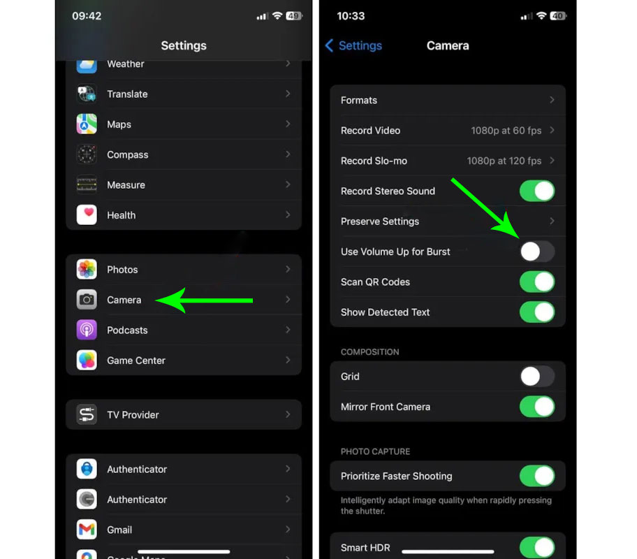 خوب جای هیچ مکثی نیست باید چند عکس متوالی بگیرید تا ببینید کدام قاب قدم زدن زیباتر خواهد شد. پس بهتره قابلیت عکس های متوالی را انتخاب کنید تا از میان عکس های گرفته شده یک مورد خوشایند بشود. عکاسی از قاب پشت بهترین گزینه خواهد بود. برای فعال سازی این قابلیت کافی است به تنظیمات گوشی بروید و سپس وارد بخش Camera بشوید از منوهای بالایی بخش های فرمت Use Volume Up to Burst را انتخاب کنید.