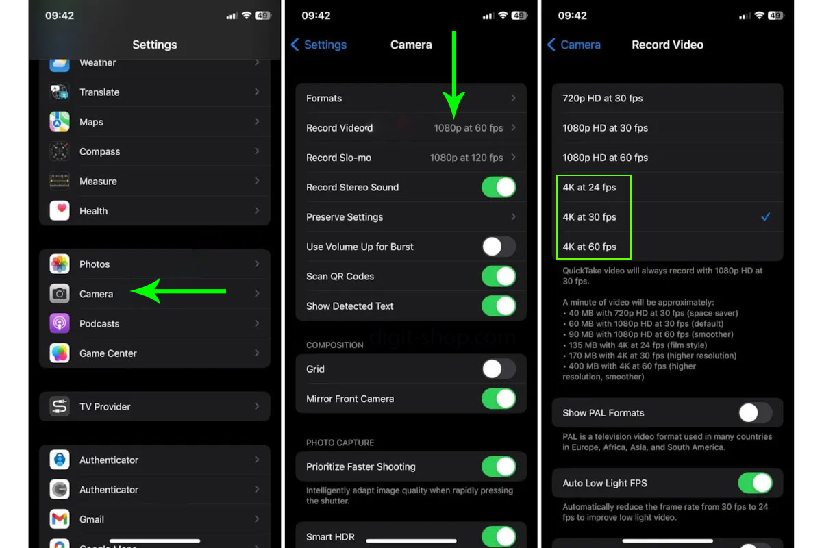 برای فعال سازی این قابلیت در نسخه های به روز آیفون باید به منو تنظیمات بروید سپس وارد منو دوربین Camera بشوید در منو باز شده به بخش Record Video بروید و یکی از مدل های 4K را انتخاب کنید هرچه عدد فریم بیشتر باشد کیفیت بیشتر می شود. در نظر داشته باشید همان طور که در بخش توضیحات گوشی آیفون اشاره کرده است هرچه کیفیت را افزایش دهید حجم آن نیز افزایش پیدا می کند.