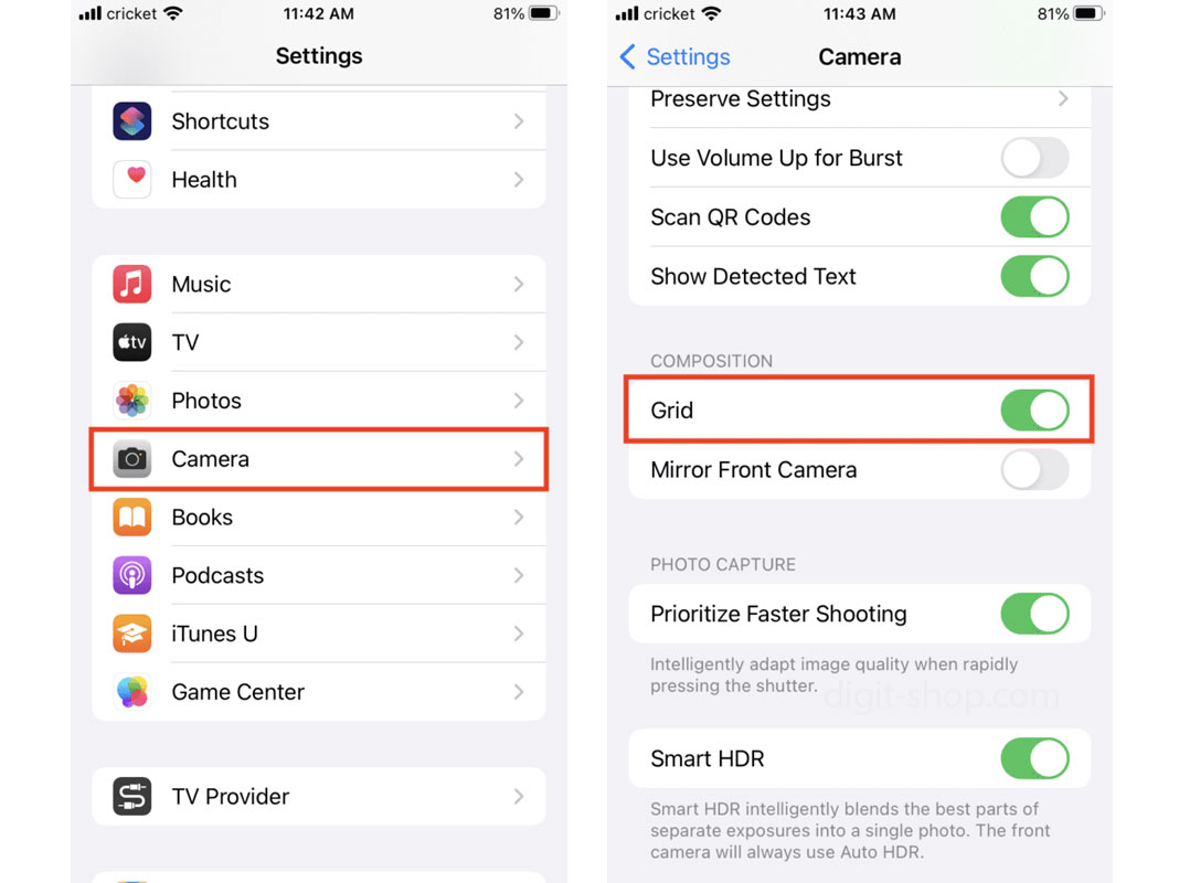 در نظر داشته باشید بعد از مشاهده عکس ها و مقایسه آن با افرادی که با آیفون خود عکس های ظریفی می گیرند درک خواهید نمود. از لحاظ عکاسان قابلیت گرید، در عکاسی خیلی مفید واقع می شود. برای فعال سازی کافی است به تنظیمات گوشی مراجعه کرد و منو دوربین Camera را لمس کنید و در بخش کاپوزیشن composition دکمه grid را فعال کنید.