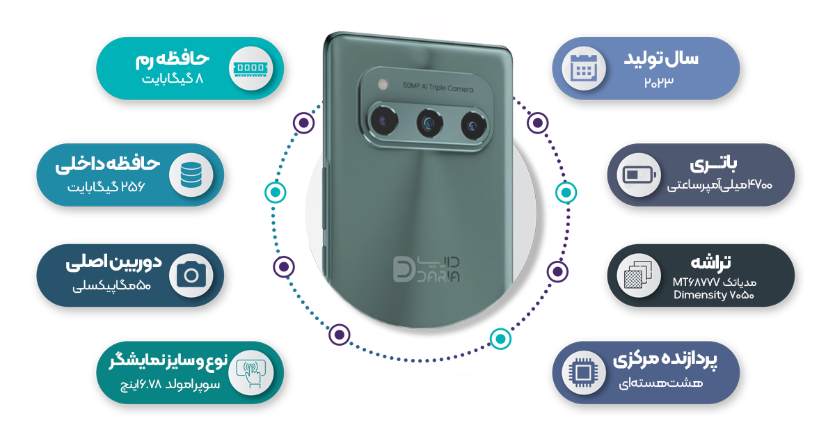 گوشی Daria به تراشه MediaTek Dimensity 7050 مجهز شده که در کنار پردازنده هشتهستهای (Cortex-A78 و Cortex-A55) و پردازنده گرافیکی Mali-G68 MC4، عملکردی پایدار و مناسب برای استفاده روزمره، چندوظیفگی و حتی اجرای بازیهای نیمهسنگین ارائه میدهد. وجود 8 گیگابایت رم و 256 گیگابایت حافظه داخلی فضای کافی برای ذخیره اطلاعات و اجرای همزمان برنامهها فراهم میکند. این گوشی با اندروید 13 و رابط کاربری DariaOS 4.0 عرضه شده که تجربهای روان و بهروز را در اختیار کاربر قرار میدهد.