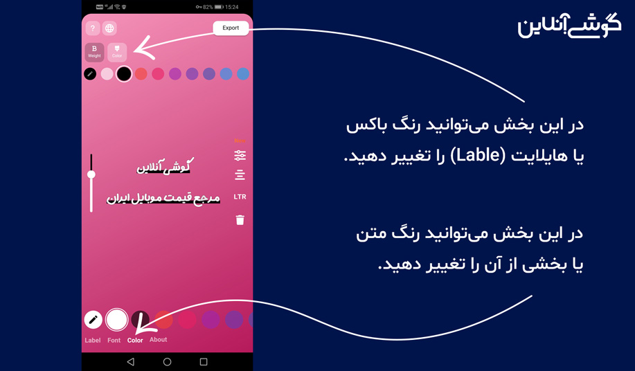 یکی از امکانات جذاب اپلیکیشن فونتو این است که امکان شخصیسازی برچسبها را برای کاربر فراهم میکند. شما میتوانید علاوهبر تغییر رنگ همه یا بخشی از متن، رنگ برچسبهای مختلفی که در بخش قبل به آنها اشاره کردیم را تغییر دهید.