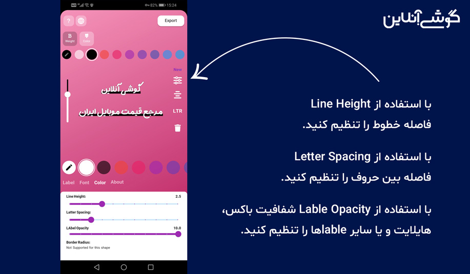 همانطورکه در تصویر مشاهده میکنید، امکان تنظیم فاصله حروف و خطوط نوشتهها در فونتو وجود دارد. همچنین، میتوانید میزان شفافیت برچسبی که برای متن انتخاب کردید را تنظیم کنید.