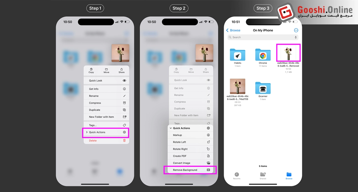 - روی تصویر نگه دارید و به مسیر Quick Actions → Remove Background بروید.