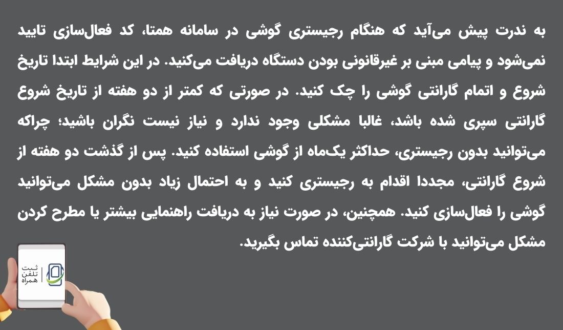 به محض خرید گوشی و تطابق مشخصات مورد نظرتان با مشخصات روی جعبه، آن را باز کنید و از سلامت فیزیکی گوشی و کامل بودن محتویات داخل جعبه مطمئن شوید. حالا نوبت به رجیستر کردن گوشی میرسد. شما از زمان خرید یک تلفن همراه، حداکثر یکماه فرصت دارید تا از طریق سامانه همتا، گوشی را رجیستر یا اطلاعات آن را ثبت کنید. توجه داشته باشید که اگر در فرصت یکماهه رجیستری اطلاعات را ثبت نکنید، گوشی، قاچاق محسوب میشود و سرویسدهی آن بهطور کامل از کار خواهد افتاد.