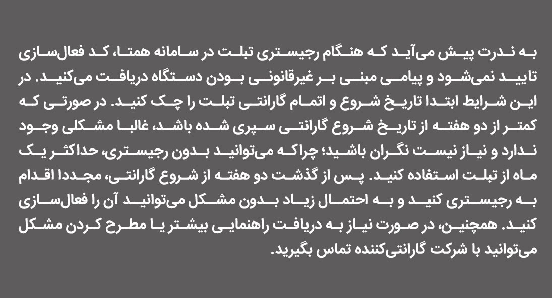 از آن جایی که تبلت جزو تجهیزات دارای سیمکارت محسوب میشود، اولین کاری که بعد از خرید باید انجام دهید، رجیستر کردن آن است. از زمان خرید تبلت، حداکثر یکماه فرصت دارید آن را رجیستر کنید. در غیر این صورت، کالا قاچاق محسوب میشود و سرویسدهی آن قطع خواهد شد.