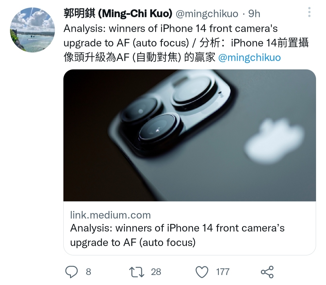 به نقل از سایت 9to5Mac، مینگچی کو در یک پست وبلاگی و همچنین در توئیتر خود اعلام کرد اپل تأمینکنندگان دوربین سلفی جدید آیفون ۱۴ را انتخاب کرده است. در حال حاضر اپل با سونی همکاری دارد که همچنان به ارائهی حسگرهای دوربین برای آیفونهای جدید ادامه خواهد داد. تأمین لنزهای موردنیاز آیفون ۱۴ برعهده Genius و Largan خواهند بود، درحالیکه Alps و Luxshare ماژول فوکوس جدید اپل را ارائه خواهند کرد.