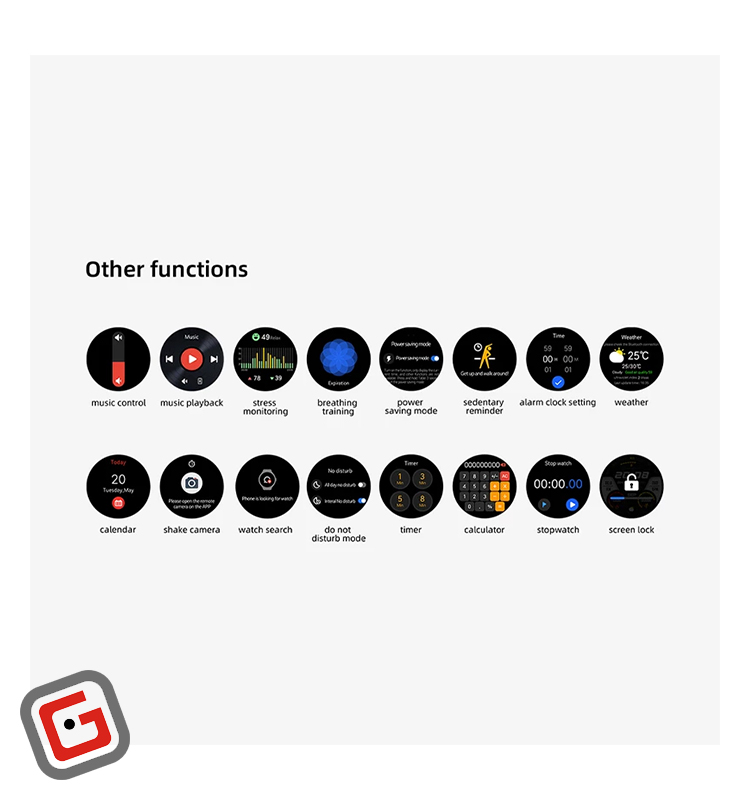 پشتیبانی از 70حالت ورزشی مختلف، کنترل موسیقی، صفحه نمایش قابل تنظیم، پایش خواب، پیدا کردن ساعت از طریق گوشی، نمایش وضعیت آب وهوا، اعلان تماس دریافتی، پایش وضعیت سلامت بانوان، برنامهی تمرین تنفس، رد تماس در حالت مزاحم نشوید، تایمر، قفل صفحه، استفاده به عنوان شاتر برای دوربین گوشی، با قابلیت پشتیبانی بیش از 30 زبان از جمله زبان فارسی