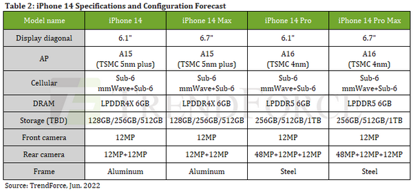 در گزارش TrendForce اشاره شده است که «برخلاف پیشنهادات قبلی، جدیدترین پردازنده اپل فقط در دو مدل آیفون 14پرو و 14 پرو مکس استفاده شده است». همان طور که اطلاع دارید آیفون 13 مینی و آیفون 13 از تراشه A15 به همراه 4 گیگابایت رم و پردازنده گرافیکی چهار هستهای بهره میبردند، همچنین مدلهای آیفون 13 پرو از تراشه A15 با 6 گیگابایت رم و یک پردازنده گرافیکی 5 هستهای همراه بودند. اعتقاد بر این است که آیفون 14 و 14 مکس از تراشه A15 با قدرت رم و پردازنده گرافیکی بیشتر استفاده خواهند کرد.