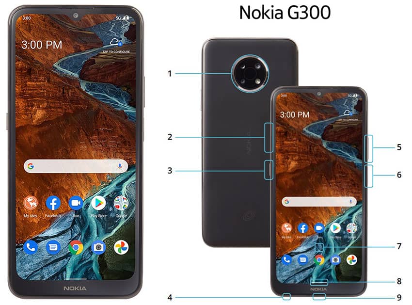 از امکانات نوکیا G300 میتوان به پشتیبانی از فناوری 5G، بلوتوث 5.0، ورودی جک 3.5 میلی متر، درگاه کارت حافظهی جانبی، درگاه اتصال USB Type-C 2.0، امکان اتصال از طریق NFC و حسگر تشخیص اثر انگشت اشاره کرد.