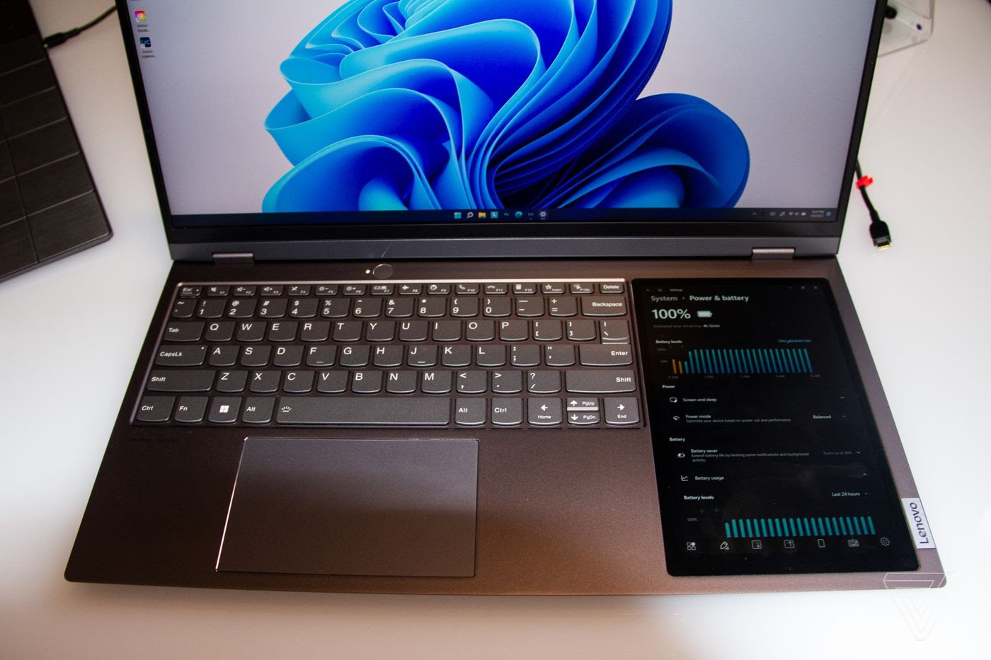 اما مهمترین ویژگی این لپتاپ که خود را نسبت به بقیه لپتاپها متمایز میکند، وجود یک صفحهنمایش ثانویه 8 اینچی با رزولوشن 800 در 1280 پیکسل است که در سمت راست کیبورد قرار دارد.
