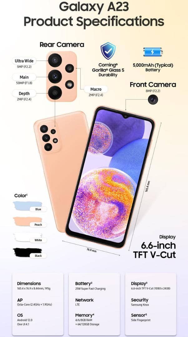 کاربران میتوانند Galaxy A23 را با قیمت پایه حدود 300 دلار در رنگهای مشکی، گلبهی، آبی و سفید از اواخر ماه مارس خریداری کنند.