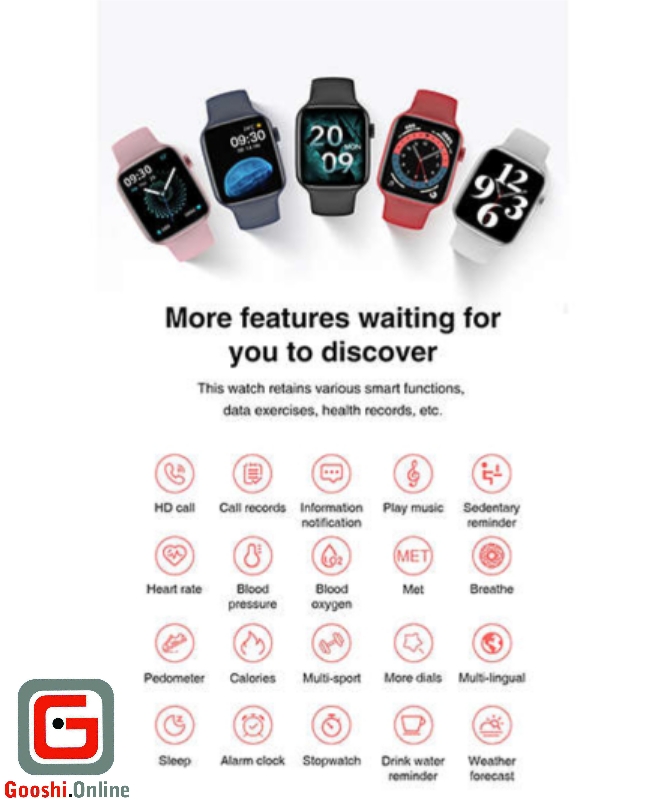 گام شمار، ده ها مود ورزشی، سنجش ضربان قلب، سنجش فشار خون، سنجش اکسیژن خون، سنجش دمای بدن، کنترل موزیک، دوربین گوشی و ضبط صدا، سنجش میزان خواب، امکان مکالمه (دارای میکروفون و اسپیکر)، نمایش منو ساعت به 5 مدل مختلف، بند قابل تعویض با تمامی بند های اپل واچ سایز 44/42، ماشین حساب، نمایش آب و هوا، تایمر، نمایش اعلان و پیام های گوشی، پشتیبانی از زبان فارسی جهت نمایش پیام ها، یادآور نوشیدن آب
