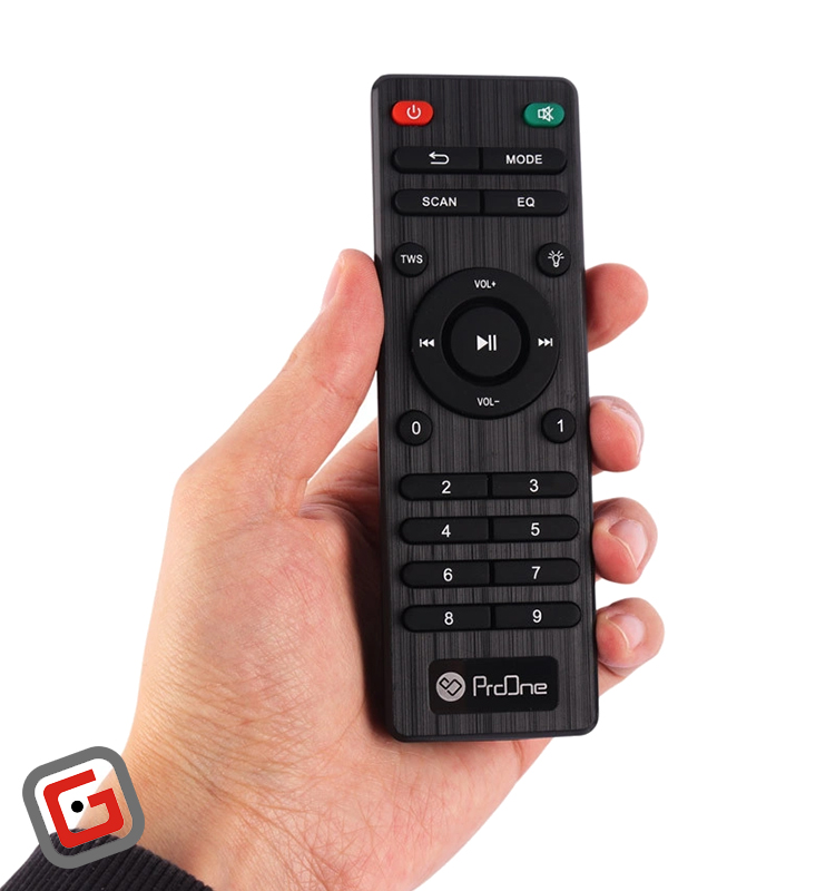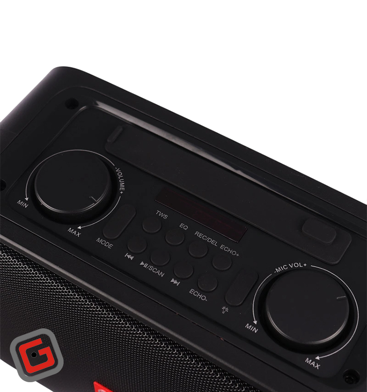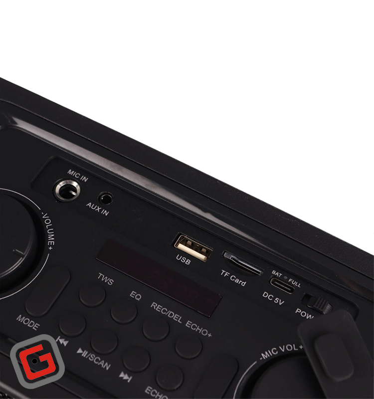 دکمهی پاور، دکمهی تنظیم نورپردازی، دکمهی انتخاب منبع پخش، دکمهی تنظیم EQ، دکمهی TWS، دکمهی تنظیم Echo، غلتک تنظیم صدای اسپیکر، غلتک تنطیم صدای میکروفون