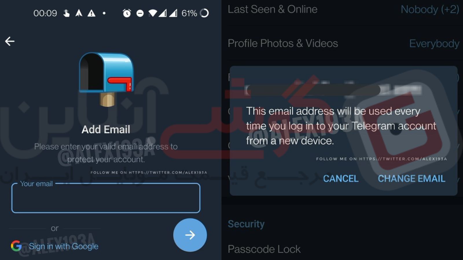 در یکی از اسکرینشاتها مشاهده میشود که قابلیت جدید در منوی تنظیمات Privacy and Security تلگرام افزوده میشود. با ورود به گزینهی مربوطه، چنین پیامی به کاربر نشان داده میشود: «هر بار که از دستگاهی جدید در حساب کاربری تلگرام خود لاگین کنید، از این آدرس ایمیل استفاده خواهد شد.»